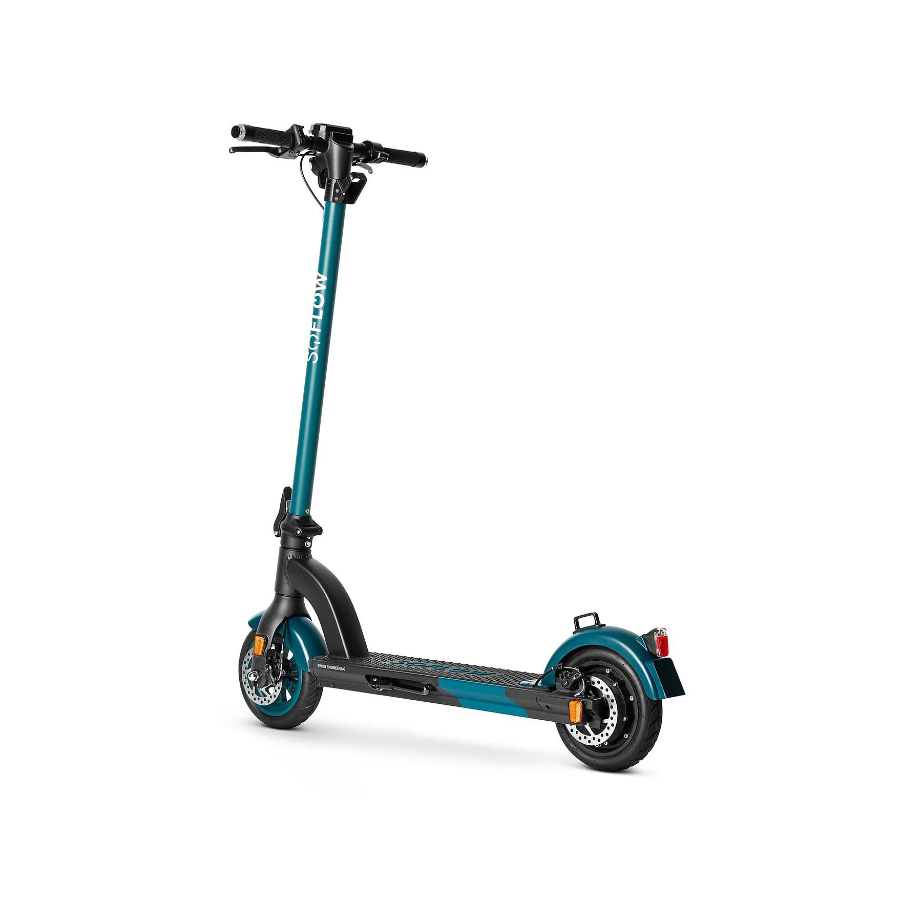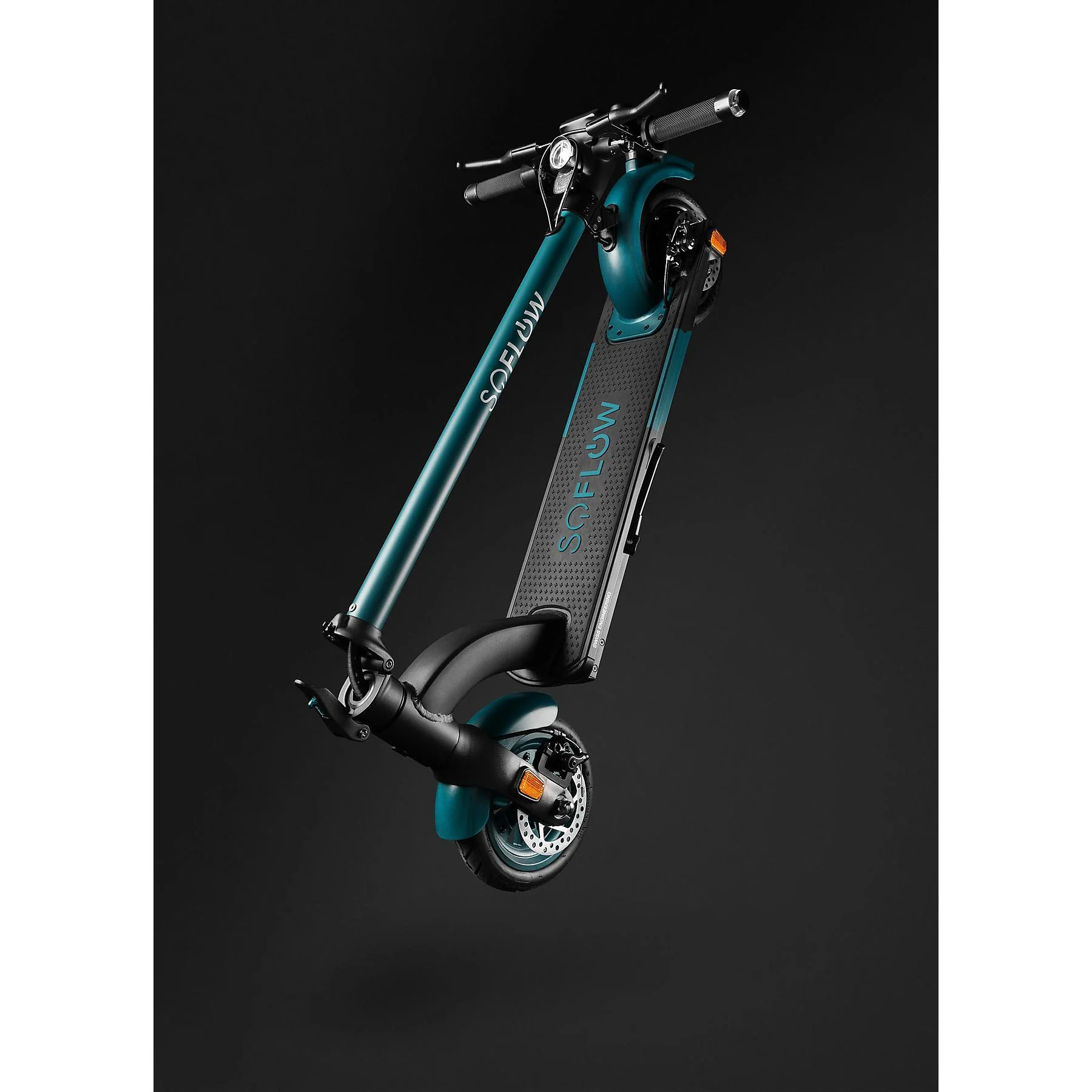 Die robuste und stabile Konstruktion, kombiniert mit punktgenau dosierter Bremskraft der vorderen und hinteren Scheibenbremsen, sorgen für maximale Kontrolle in jeder Situation. Zusätzliche Sicherheit beim Abbiegen garantieren die am Lenker integrierten Blinker. Die Zulassung für den deutschen Straßenverkehr, inklusive leuchtstarkem Front- und Rücklicht ist bei SoFlow selbstverständlich. Der 450-Watt-Motor meistert mühelos Reichweiten von bis zu 30 Kilometern und dank des hochwertigen Rahmens mit extrabreitem Trittbrett transportiert er problemlos 150 kg.
